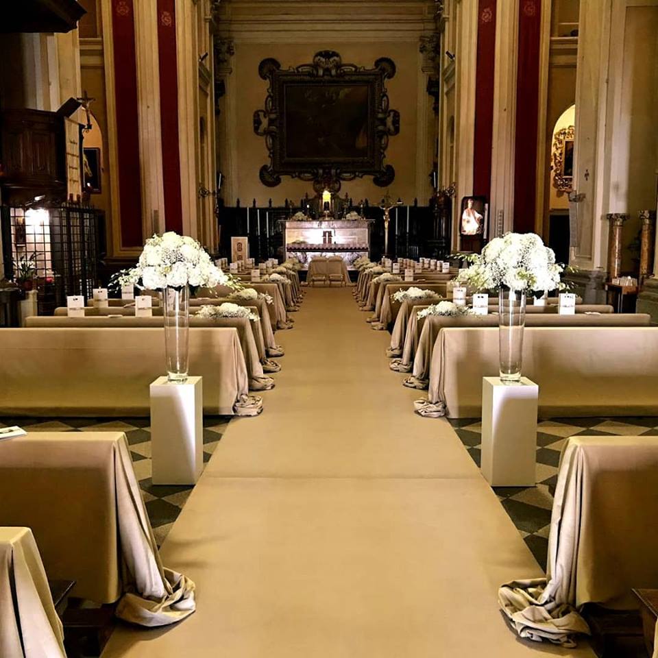 Drappi e guida bianca (o nei toni dell’avorio) faranno sembrare anche la più piccola delle chiese più ampia; con i fiori potrete spaziare come più vi piace: ortensie, lisiathus, orchidee fino alle più classiche rose!